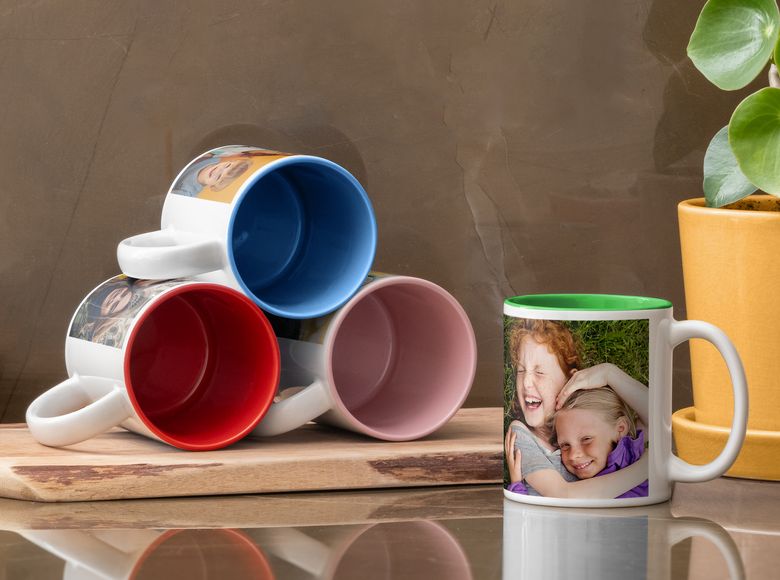 During our custom mug printing process your photos are embedded into the ceramic through a process known as sublimation that uses heat and special top-quality inks. Imagine a big oven – essentially, your photos are baked into your personalised mugs so they won't come off.